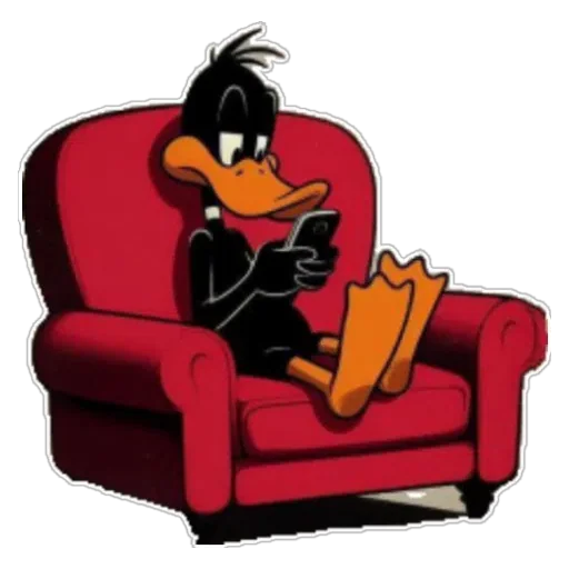 Pato Donald sentado em um sofá vermelho, com expressão séria, olhando para um celular.