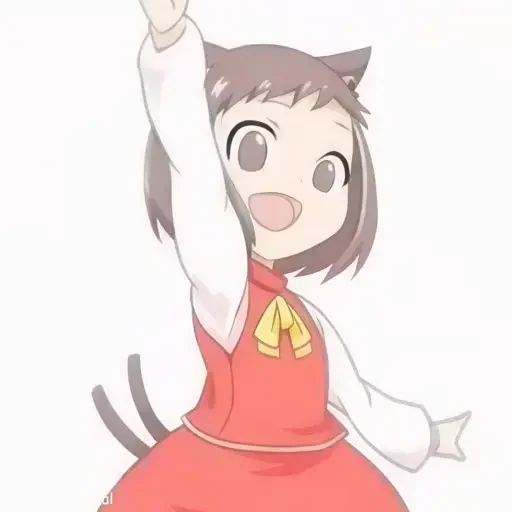 Garota de anime com cabelo castanho e orelhas de gato, vestindo um avental vermelho com um colarinho vermelho e uma faixa amarela, com um braço levantado e um sorriso.