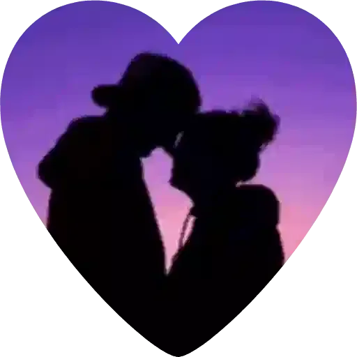 Um casal se beijando em silhueta contra um pôr do sol, dentro de um coração roxo.