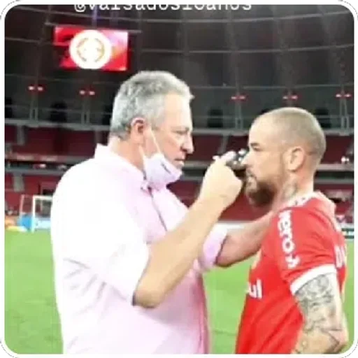 Dois homens em um campo de futebol, um mais velho com cabelo grisalho e camisa rosa aplicando um spray na boca do outro, que tem uma camisa vermelha e um braço tatuado.