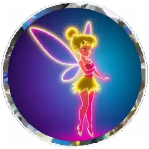 Uma fada com asas de neon rosa e amarelo, cabelo castanho em um coque, vestida com um mini vestido amarelo e rosa, contra um fundo roxo e azul.