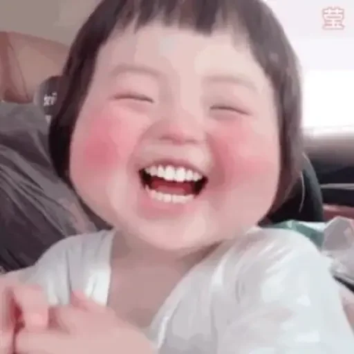 Menina com bochechas rosadas e sorriso largo, parecendo feliz e rir.