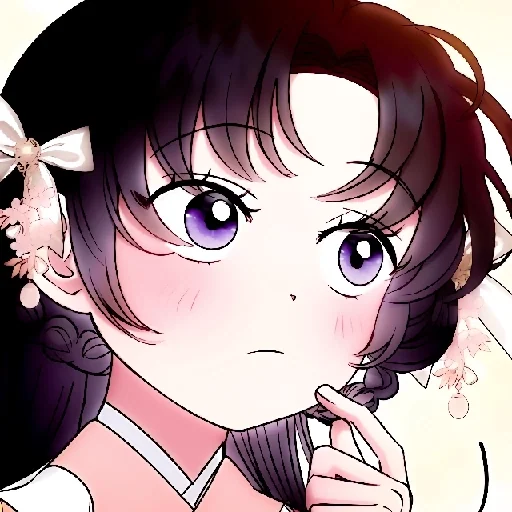 Garota de anime com cabelo escuro e laço rosa, olhos roxos, corada e pensativa, tocando o queixo.