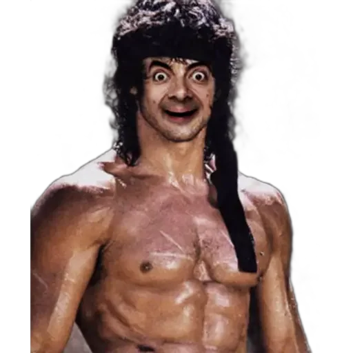Homem musculoso e sem camisa com expressão surpresa e cabelos pretos e longos.