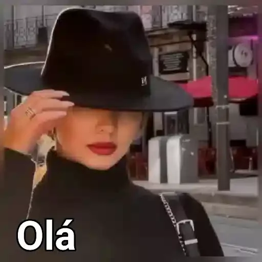 Mulher loira usando um chapéu preto e um suéter preto, tocando o chapéu com a mão. A palavra 'Olá' está escrita no canto inferior esquerdo.