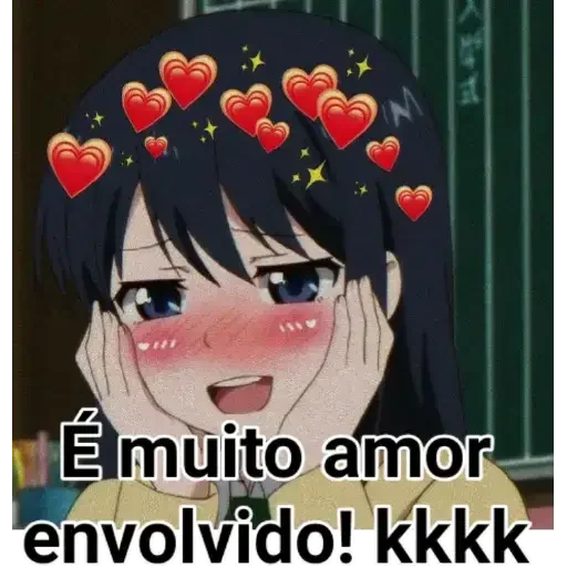 Garota de anime com as mãos no rosto, bochechas rosadas e corações vermelhos sobre a cabeça. O texto 'É muito amor envolvido! kkkk' está escrito embaixo.