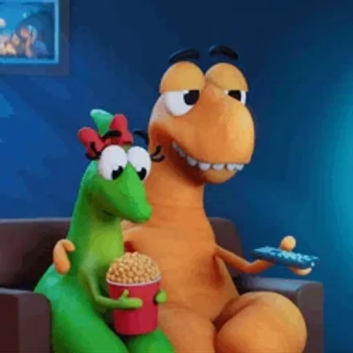 Dois dinossauros, um verde e um laranja, sentados no sofá assistindo TV, o verde segurando uma tigela de pipoca.