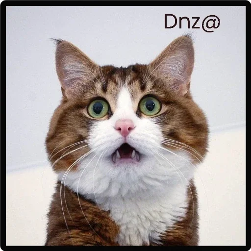 Gato marrom com olhos verdes e focinho branco, parecendo surpreso ou falando algo. O texto 'Dnz@' aparece no canto superior direito.