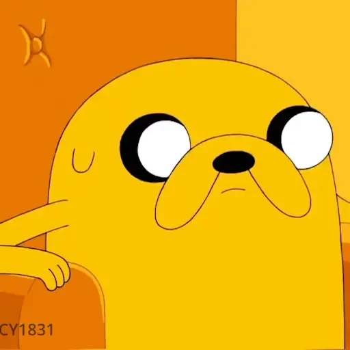 Um desenho do personagem Lumpy Space Dog, com expressão confusa e um sorriso leve, contra um fundo laranja e amarelo.
