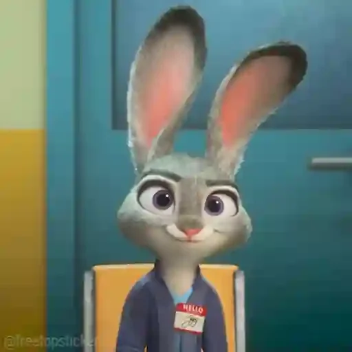 Um coelho cartoon com orelhas grandes e olhos grandes, usando um crachá e uma camisa azul, sentado em uma cadeira laranja.