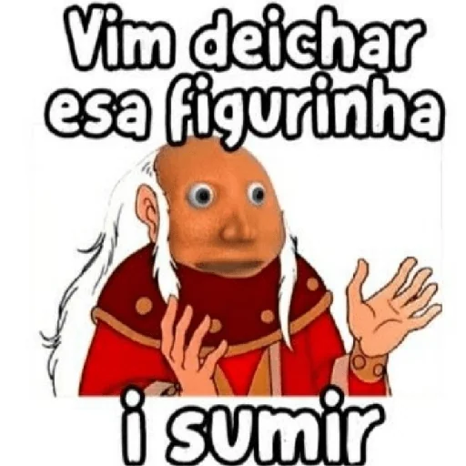 Um personagem de anime com cabelos brancos e um casaco vermelho fazendo um gesto de surpresa ou questionamento, com as frases 'Vim deixar essa figurinha' e 'i sumir' escritas em preto.