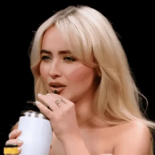 Mulher loira com expressão surpresa ou pensativa, segurando uma embalagem branca e tocando o lábio.