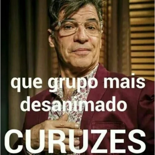 Um homem mais velho com expressão séria e óculos, vestindo um blazer vermelho, com as palavras 'que grupo mais desanimado CURUZES' sobrepostas à imagem.
