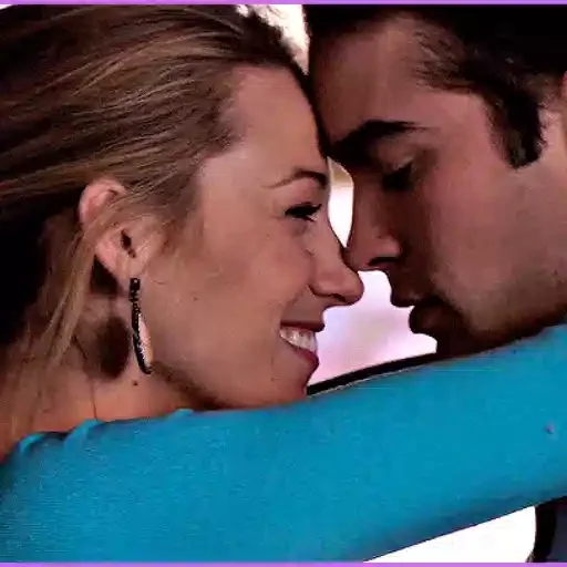 Um casal se beijando, a mulher com o cabelo castanho claro e um suéter azul, o homem com o cabelo castanho escuro, ambos com expressões felizes.