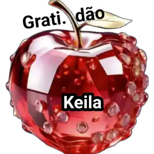 Uma maçã vermelha brilhante com gotículas de água, texto 'Grati. dão' e 'Keila' sobreposta.