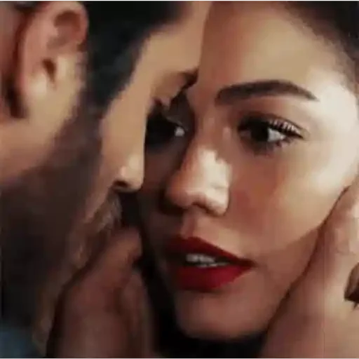 Um homem beijando o rosto de uma mulher com maquiagem pesada e lábios vermelhos.