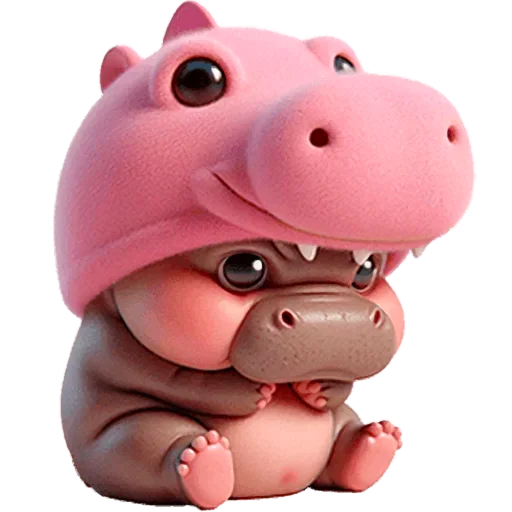 Um hipopótamo rosa com olhos grandes e um chapéu de dinossauro rosa com dentes.