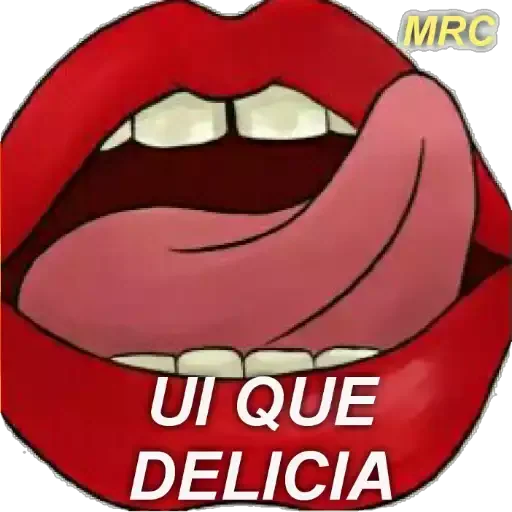 Uma boca com os lábios vermelhos e a língua para fora, com os dentes aparecendo. A texto 'UI QUE DELICIA' está escrito embaixo da boca em letras brancas. Há um pequeno texto 'MRC' no canto superior direito.