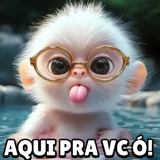 Um macaco branco fofinho com óculos de sol está na água com a língua para fora e a legenda 'AQUI PRA VC Ó!'