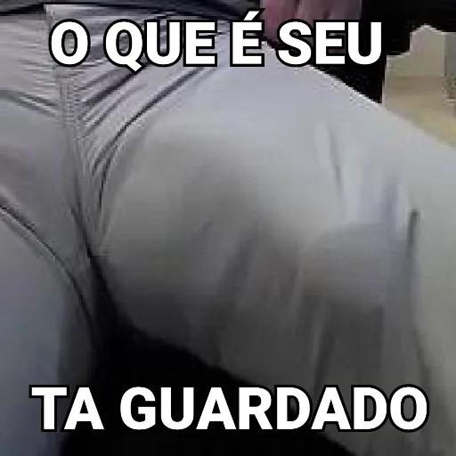 Imagem de uma pessoa vestida com calça cinza, com as frases 'O QUE É SEU' e 'TA GUARDADO' sobrepostas.