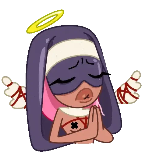 Uma personagem de anime com longos cabelos roxos, máscara roxa nos olhos, auréola amarela e bandagens vermelhas nos pulsos, fazendo um gesto de rezar com as mãos.