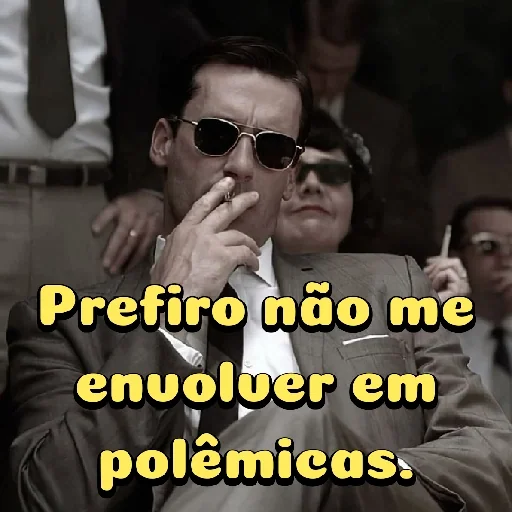 Homem de óculos escuros e terno, com a mão na frente da boca, ao lado de outra pessoa que também usa óculos escuros. Fundo escurecido com outras pessoas. Legenda amarela: 'Prefiro não me envolver em polêmicas.'