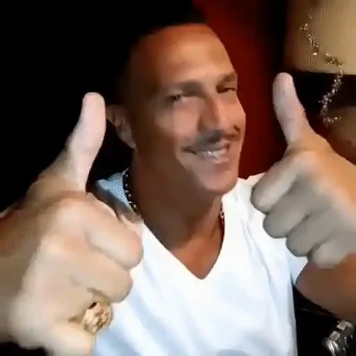 Homem com bigode e cabelo preto, usando uma camisa branca e joias, fazendo dois gestos de aprovação com os polegares para cima.