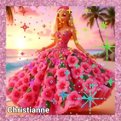 Uma mulher loira com um vestido rosa cheio de flores, em uma praia com palmeiras ao pôr do sol. O nome 'Christianne' está escrito no canto inferior esquerdo.