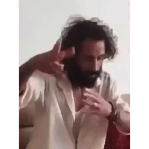Rosto de um homem com cabelo longo e barba, vestindo uma camisa branca e uma capa vermelha, com expressão séria.