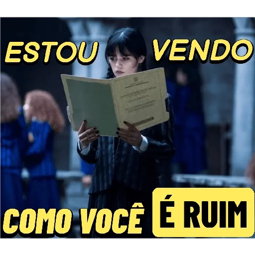 Uma imagem da série 'Wednesday', a personagem Wednesday Addams lendo um papel com expressão séria, com as frases 'ESTOU VENDO COMO VOCÊ É RUIM' sobrepostas.