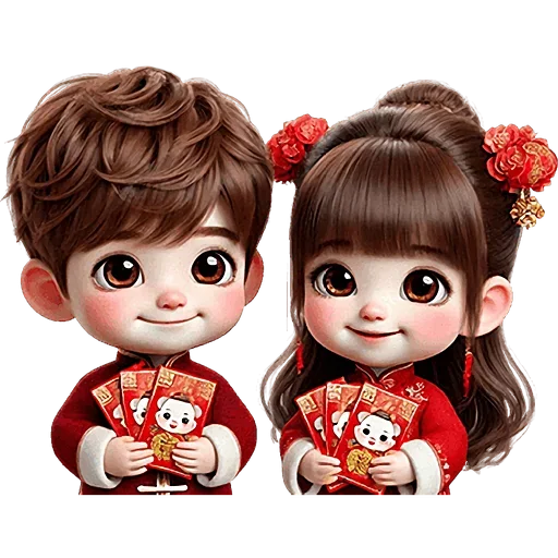 Dois personagens infantis fofos, um menino e uma menina, vestidos com roupas vermelhas e douradas, segurando dinheiro…