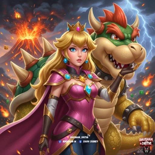 Princesa Peach e Bowser em um cenário de destruição com lava e raios, ela vestindo uma armadura rosa e ele com expressão agressiva.