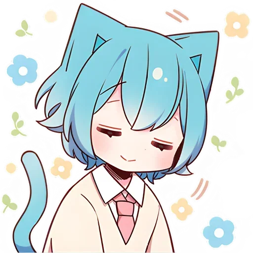Personagem de anime com cabelo azul e orelhas de gato, sorrindo com flores ao redor.