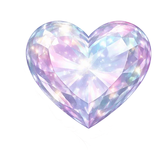 Coração de diamante brilhante com reflexos de luz em tons de rosa, azul e roxo.