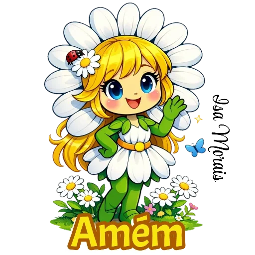 Uma menina de cabelo loiro com uma flor na cabeça e uma joaninha em uma das flores, vestida com um traje verde e branco de flor, com a palavra 'Amém' embaixo.