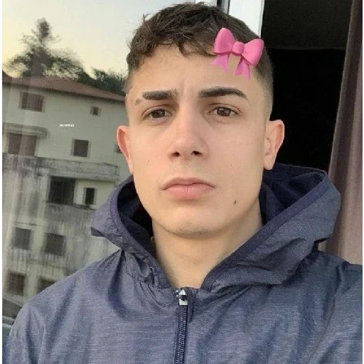 Um jovem com um brinco rosa na lateral do cabelo e uma jaqueta azul olha diretamente para a câmera com uma expressão neutra.