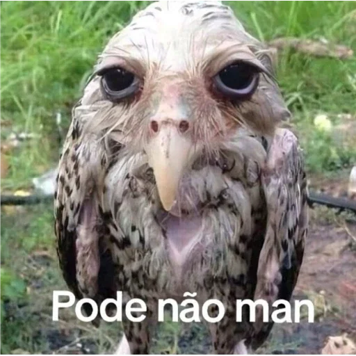 Um gavião com penas marrons e cinzas, olhos grandes e pretos, bico claro, olhando para frente com uma expressão séria. Sobreposto, o texto 'Pode não man'.