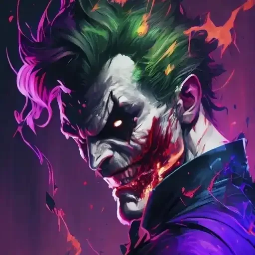 O Coringa com uma aparência sinistra, cabelo verde desgrenhado e ferimentos no rosto, com um fundo roxo escuro e chamas coloridas.