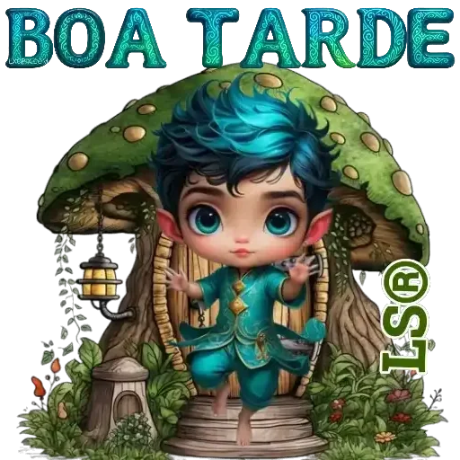 Um elfinho azul com olhos grandes e cabelos azuis, vestido de azul, aparece na entrada de uma casa em forma de cogumelo, com a frase 'BOA TARDE' em letras azuis acima.