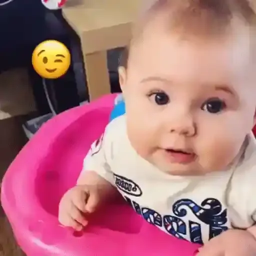 Um bebê com expressão séria, usando uma camisa branca com texto azul, sentado em uma cadeira rosa. Ao lado, um emoji amarelo sorridente.