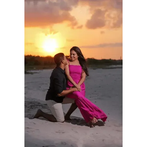 Um casal romântico em uma praia ao pôr do sol. O homem está de joelhos e beija a mão da mulher, que veste um longo vestido rosa.