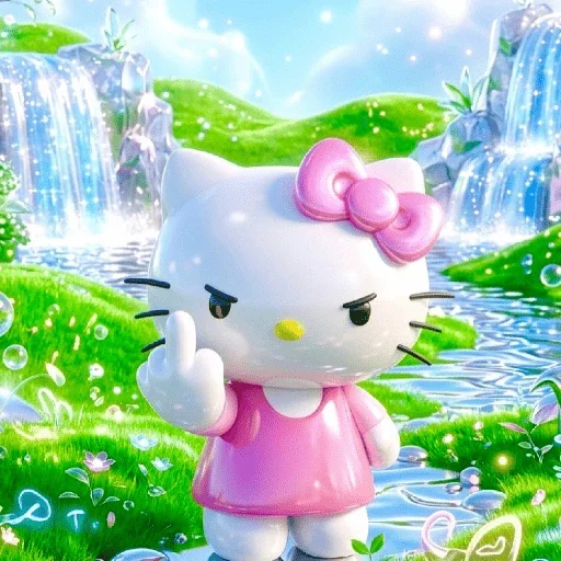 Hello Kitty com expressão séria, vestindo uma roupa rosa, fazendo um gesto com o dedo indicador levantado, em um cenário de paisagem natural com cachoeiras e flores.