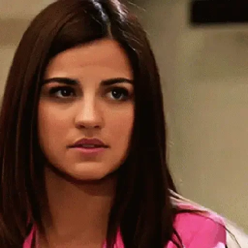 Mulher com expressão de surpresa ou preocupação, cabelo castanho e blusa rosa. Olhar para frente com sobrancelhas franzidas.