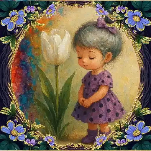 Menina com vestido roxo olhando uma tulipa branca com flores azuis e amarelas ao redor.
