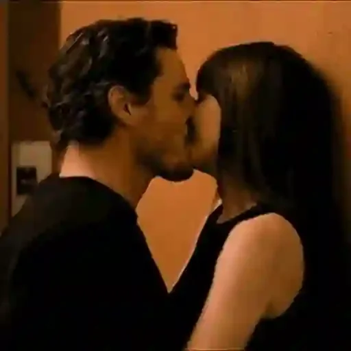 Um casal se beijando, o homem com cabelo escuro e barba, vestindo uma camisa preta, e a mulher com cabelo longo e escuro, vestindo um vestido preto, contra uma parede laranja.