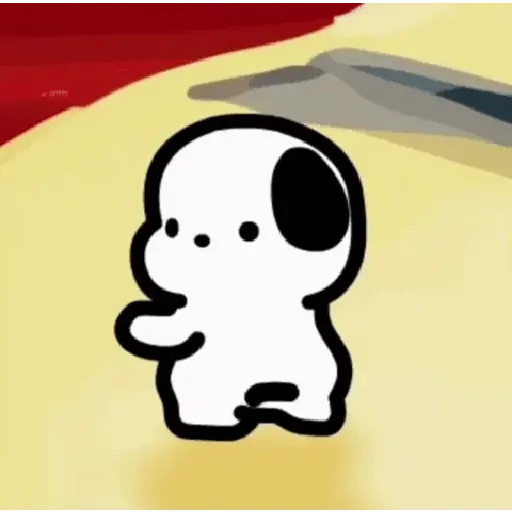 Um personagem de desenho animado branco com um olho preto e outro vazio, com uma expressão neutra, em frente a um fundo amarelo com uma faca e um triângulo vermelho.
