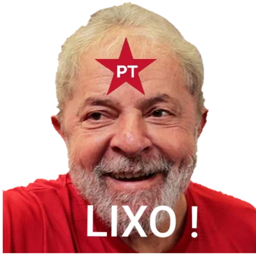 Um homem mais velho com cabelo loiro e barba grisalha, com uma estrela vermelha na testa contendo 'PT' e o texto 'LIXO!' embaixo.