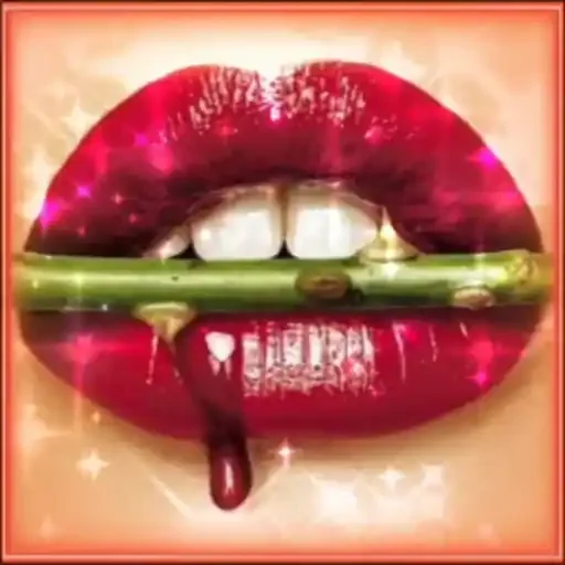 Lábios vermelhos com um vegetal entre os dentes, fundo laranja com faíscas. O texto 'LAMBA' aparece refletido nos lábios.
