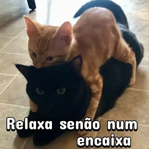 Dois gatos, um laranja em cima de um preto, com a frase 'Relaxa senão num encaixa' em texto branco com contorno preto.