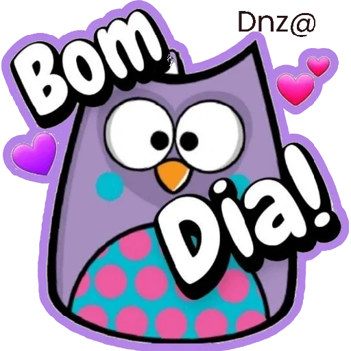 Um desenho de uma coruja roxa com olhos grandes e coração, com a frase 'Bom Dia!'